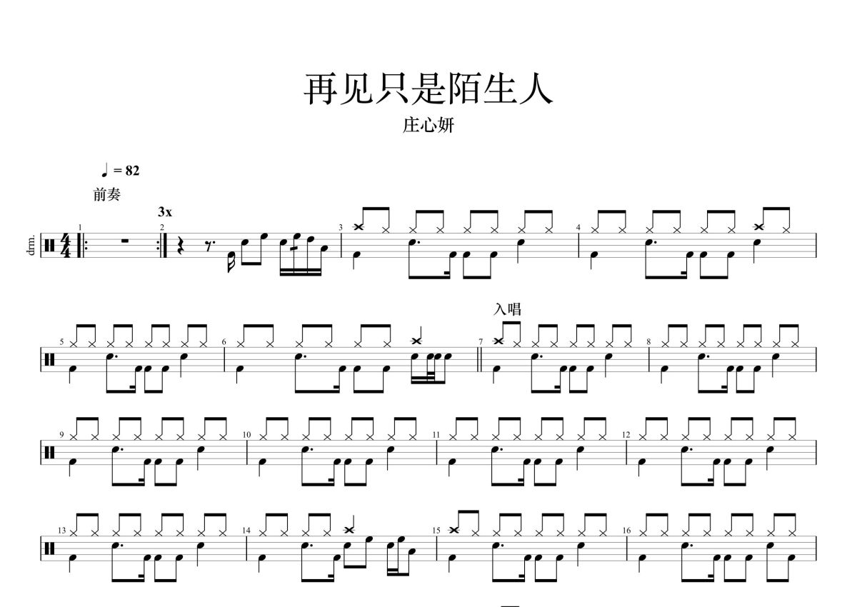 《再见只是陌生人》是庄心妍演唱的一首歌曲,这份鼓谱共有两张高清图谱,图谱由 @打鼓谱 编配上传,图谱使用五线谱编配,使用这份再见只是陌生人架子鼓谱,你将能够轻松地敲打出这首庄心妍的再见只是陌生人,快来尝试吧。庄心妍(Ada),1993年1月9日出生于广东省陆丰市,中国内地流行乐女歌手。2012年,因发行首支单曲《一万个舍不得》,从而正式出道。2013年,获得酷狗繁星网新声代歌唱比赛第二名。2015年,凭专辑《一直想着他》获得第14届华鼎奖华语年度最受欢迎专辑奖。2014年,其演唱的歌曲《一万个舍不得》获得酷狗音乐年度最受欢迎彩铃金曲。