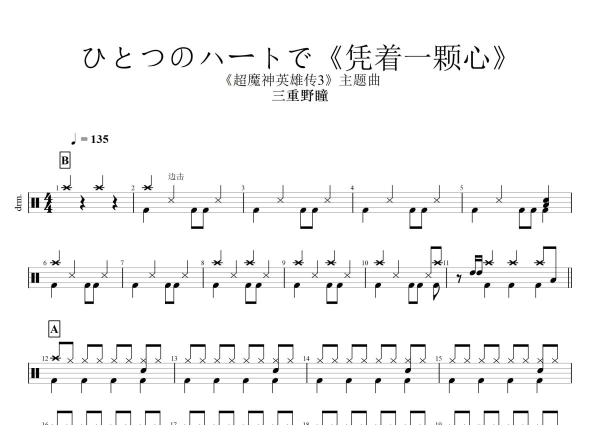 《凭着一颗心》是三重野瞳演唱的一首歌曲,这份鼓谱共有四张高清图谱,图谱由 @打鼓谱 编配上传,图谱使用五线谱编配,使用这份凭着一颗心架子鼓谱,你将能够轻松地敲打出这首三重野瞳的凭着一颗心,快来尝试吧。《ひとつのハートで》(《凭着一颗心》)是日漫动画《超魔神英雄传3》中的主题曲。