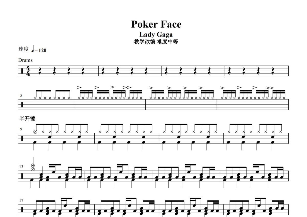 《Poker Face》是Lady Gaga演唱的一首歌曲,这份鼓谱共有两张高清图谱,图谱由 @打鼓谱 编配上传,图谱使用五线谱编配,使用这份Poker Face架子鼓谱,你将能够轻松地敲打出这首Lady Gaga的Poker Face,快来尝试吧。《PokerFace》是美国女歌手LadyGaga演唱的一首流行舞曲,歌词、曲谱由LadyGaga和RedOne共同创作,RedOne负责音乐制作[1]。该歌曲被收录在LadyGaga于2008年8月19日发行的的首张录音室专辑《TheFame》[2],并作为推广专辑的第二支单曲,于2008年9月26日通过新视镜唱片公司发布。