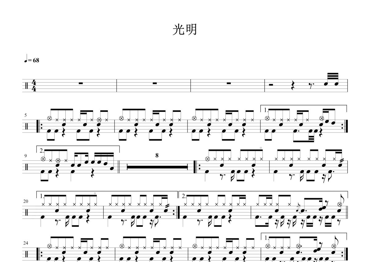 《光明》是汪峰演唱的一首歌曲,这份鼓谱共有两张高清图谱,图谱由 @打鼓谱 编配上传,图谱使用五线谱编配,使用这份光明架子鼓谱,你将能够轻松地敲打出这首汪峰的光明,快来尝试吧。《光明》是由汪峰作词、作曲,汪峰演唱的歌曲,发行于2009年7月25日。电视剧《向着炮火前进》主题曲。