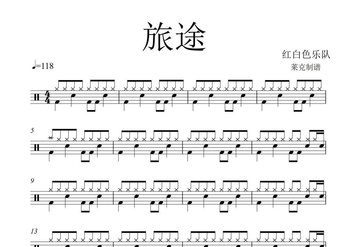 《旅途》是红白色乐队演唱的一首歌曲,这份鼓谱共有四张高清图谱,图谱由 @打鼓谱 编配上传,图谱使用五线谱编配,使用这份旅途架子鼓谱,你将能够轻松地敲打出这首红白色乐队的旅途,快来尝试吧。红白色,兰州的一支独立摇滚乐队。乐队由包包,耿桐和豆子组成。红白色乐队成立于2012年,经过几次人员调整直到2015年初主唱包包的加入乐队得以正式确立,并且乐队风格较之前也有所改变,以Indie pop(独立流行)为主其中加入了New wave(新浪潮)等新音乐形式的元素。主唱特别的声音加上新的音乐元素形成了不一样的“女声独立摇滚”。乐队代表作品:《旅途》《I´m sorry》等。