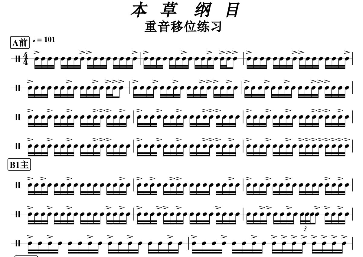 《本草纲目》是周杰伦演唱的一首歌曲,这份鼓谱共有四张高清图谱,图谱由 @打鼓谱 编配上传,图谱使用五线谱编配,使用这份本草纲目架子鼓谱,你将能够轻松地敲打出这首周杰伦的本草纲目,快来尝试吧。该歌曲杂糅了美式嘻哈和中国风,用诙谐幽默的嘻哈元素让曲风鲜活起来,充满创意,另外歌名取自经典医书《本草纲目》,歌词里还用了16种古老的药材名,让年轻人大开眼界,了解中华民族的智慧。