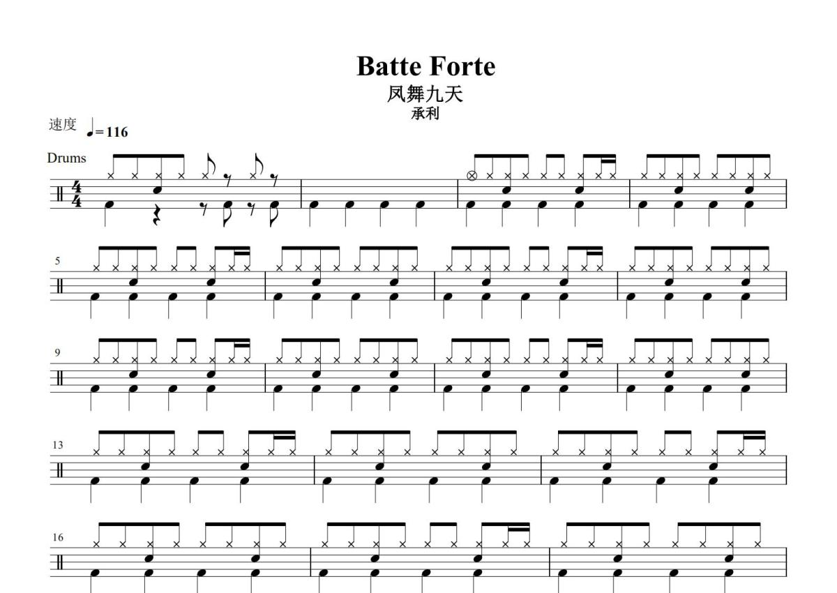 《Batte Forte》是Lollipop、Subside演唱的一首歌曲,这份鼓谱共有三张高清图谱,图谱由 @打鼓谱 编配上传,图谱使用五线谱编配,使用这份Batte Forte架子鼓谱,你将能够轻松地敲打出这首Lollipop、Subside的Batte Forte,快来尝试吧。简介:《Batte Forte》是Lollipop、Subside所演唱的歌曲,收录在《Batte forte》专辑当中,于2005年3月8日发行。