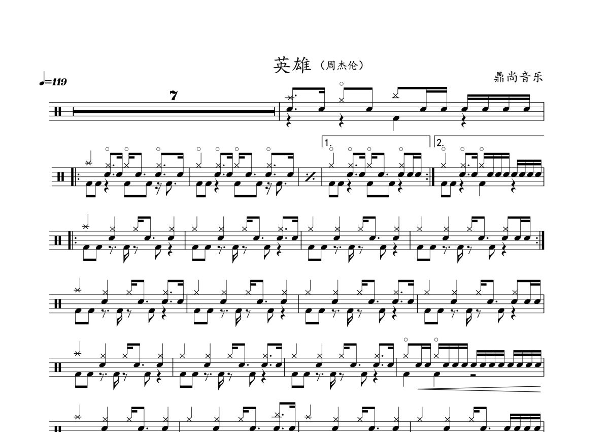 《英雄》是周杰伦演唱的一首歌曲,这份鼓谱共有两张高清图谱,图谱由 @打鼓谱 编配上传,图谱使用五线谱编配,使用这份英雄架子鼓谱,你将能够轻松地敲打出这首周杰伦的英雄,快来尝试吧。《英雄》是周杰伦演唱的一首歌曲,由周杰伦作词、作曲,黄雨勋编曲 ,2016年3月24日以单曲形式发行 ,后收录于周杰伦2016年6月24日第14张专辑《周杰伦的床边故事》中 。该歌曲是《英雄联盟》中国品牌主题曲。