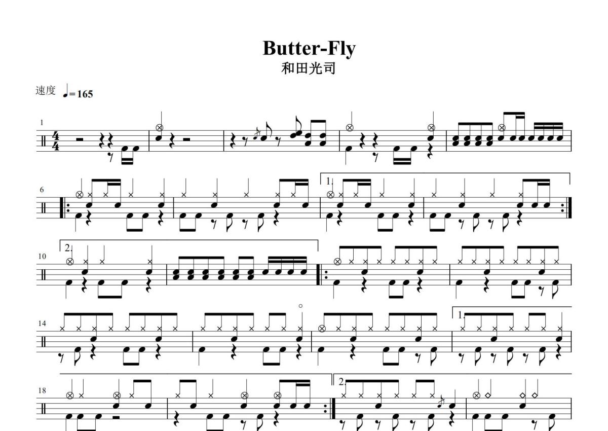 《Butter-Fly》是和田光司演唱的一首歌曲,这份鼓谱共有四张高清图谱,图谱由 @打鼓谱 编配上传,图谱使用五线谱编配,使用这份Butter-Fly架子鼓谱,你将能够轻松地敲打出这首和田光司的Butter-Fly,快来尝试吧。《Butter-Fly》是由和田光司演唱,千绵伟功作词作曲,渡部チェル编曲的歌曲,是TV动画《数码宝贝》的主题曲,发行于1999年4月23日,2004年8月1日发行再版,最初收录于和田光司的首张原创专辑《all of my mind》 [1-2] 。