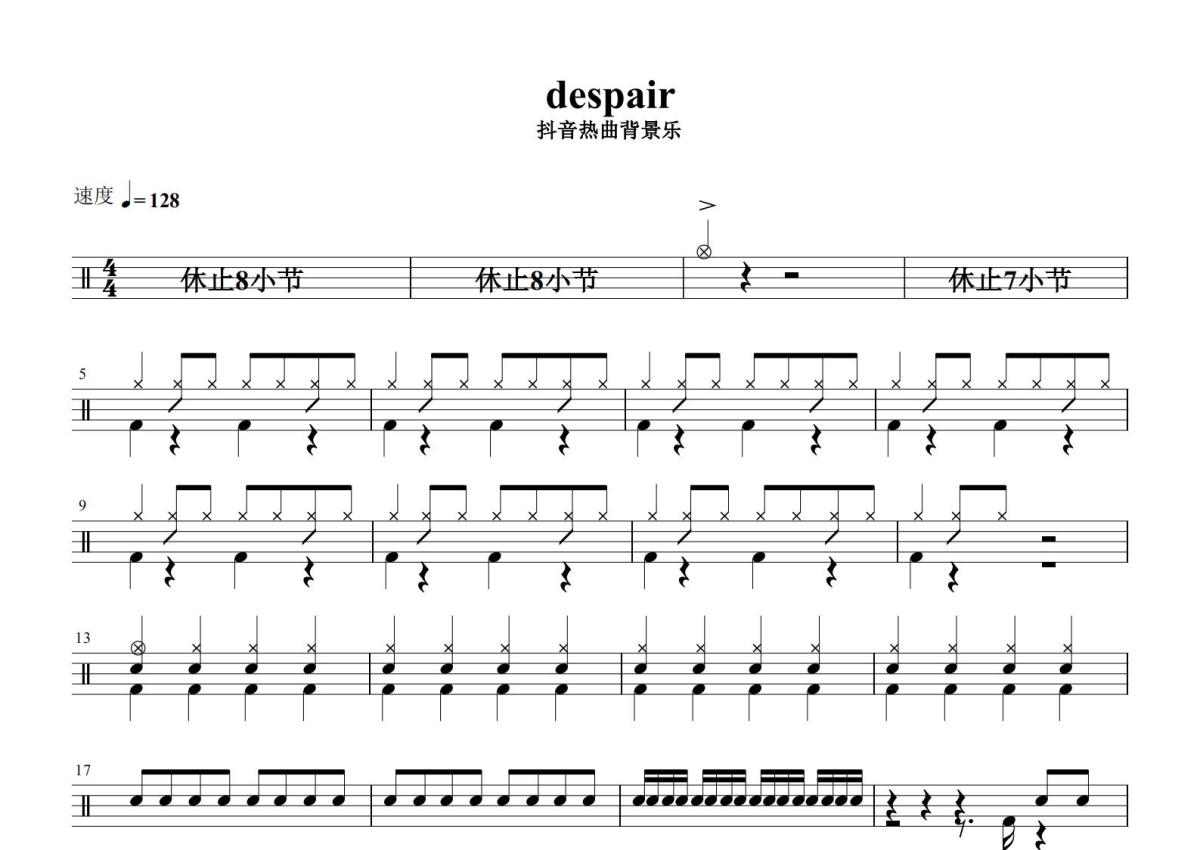 《Despair》是lookedatherfore演唱的一首歌曲,这份鼓谱共有三张高清图谱,图谱由 @打鼓谱 编配上传,图谱使用五线谱编配,使用这份Despair架子鼓谱,你将能够轻松地敲打出这首lookedatherfore的Despair,快来尝试吧。《Despair》lookedatherfore抖音超流行背景音乐。