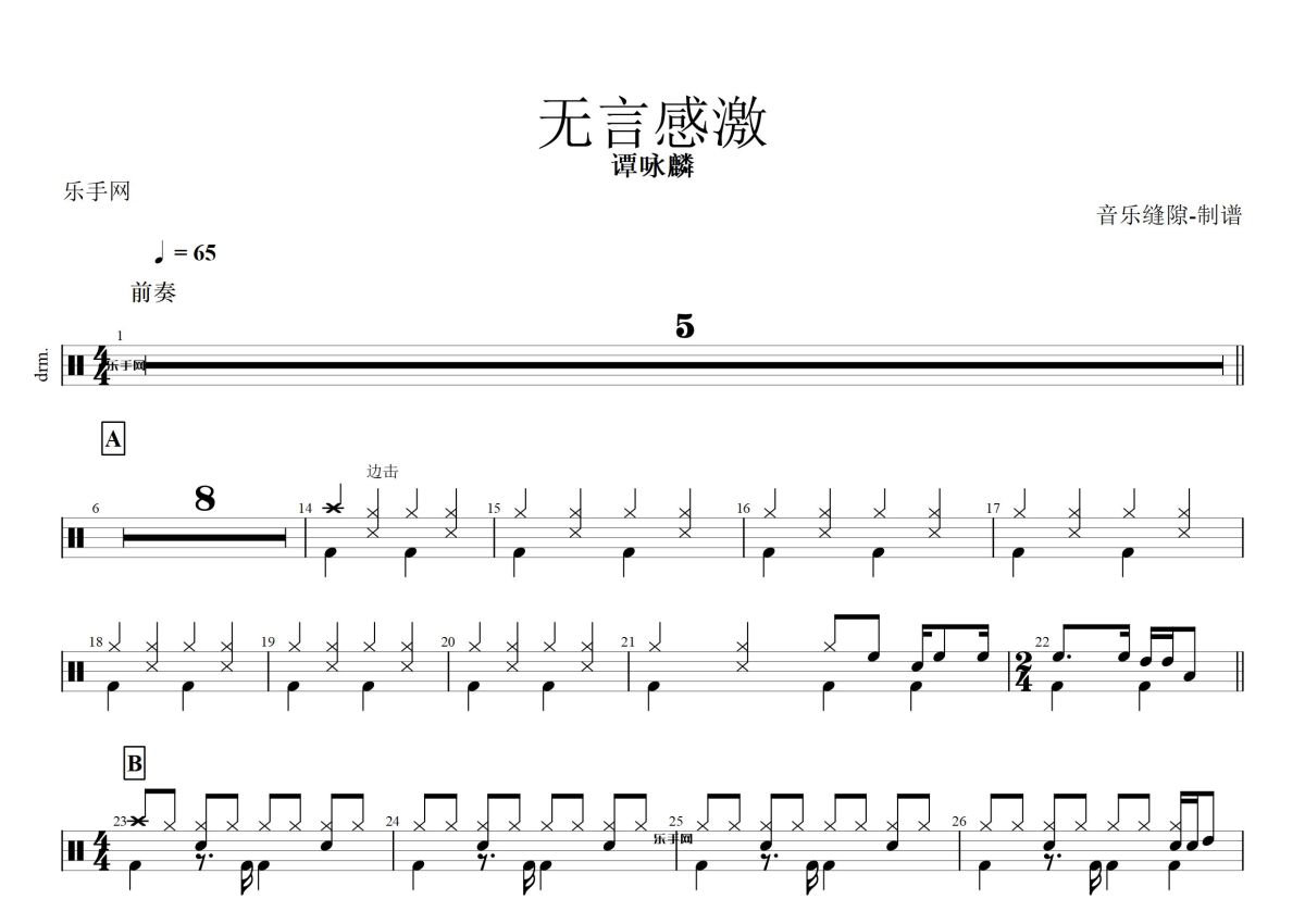 《无言感激》是谭咏麟演唱的一首歌曲,这份鼓谱共有两张高清图谱,图谱由 @打鼓谱 编配上传,图谱使用五线谱编配,使用这份无言感激架子鼓谱,你将能够轻松地敲打出这首谭咏麟的无言感激,快来尝试吧。谭咏麟《无言感激》架子鼓谱,小青编配出品,共有2张高清图谱,免翻页排版设计。