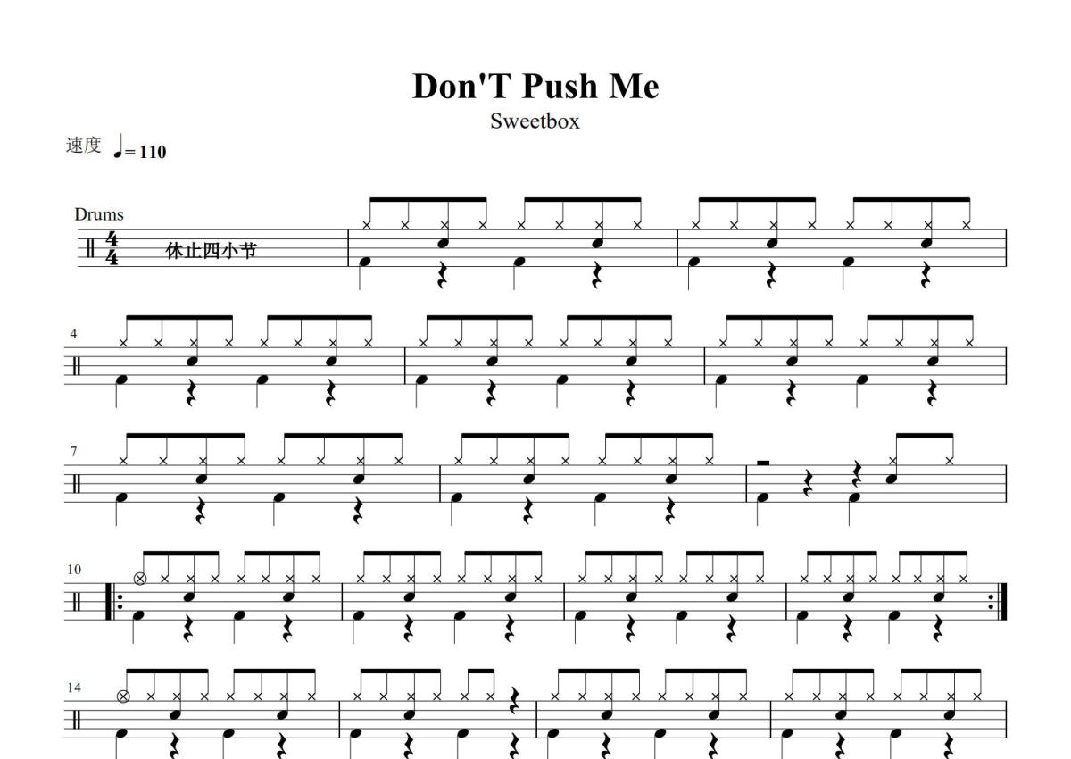 《Dont push me》是Sweetbox演唱的一首歌曲,这份鼓谱共有两张高清图谱,图谱由 @打鼓谱 编配上传,图谱使用五线谱编配,使用这份Dont push me架子鼓谱,你将能够轻松地敲打出这首Sweetbox的Dont push me,快来尝试吧。《Don't Push Me》是由蒂娜·哈里斯(Tina Harris)作为主唱的糖果盒子组合(Sweetbox)演唱的一首歌曲 [1-3] 。收录于爱贝克思娱乐(Avex Entertainment Inc.)公司2002年1月1日发行的专辑《Jade》中。