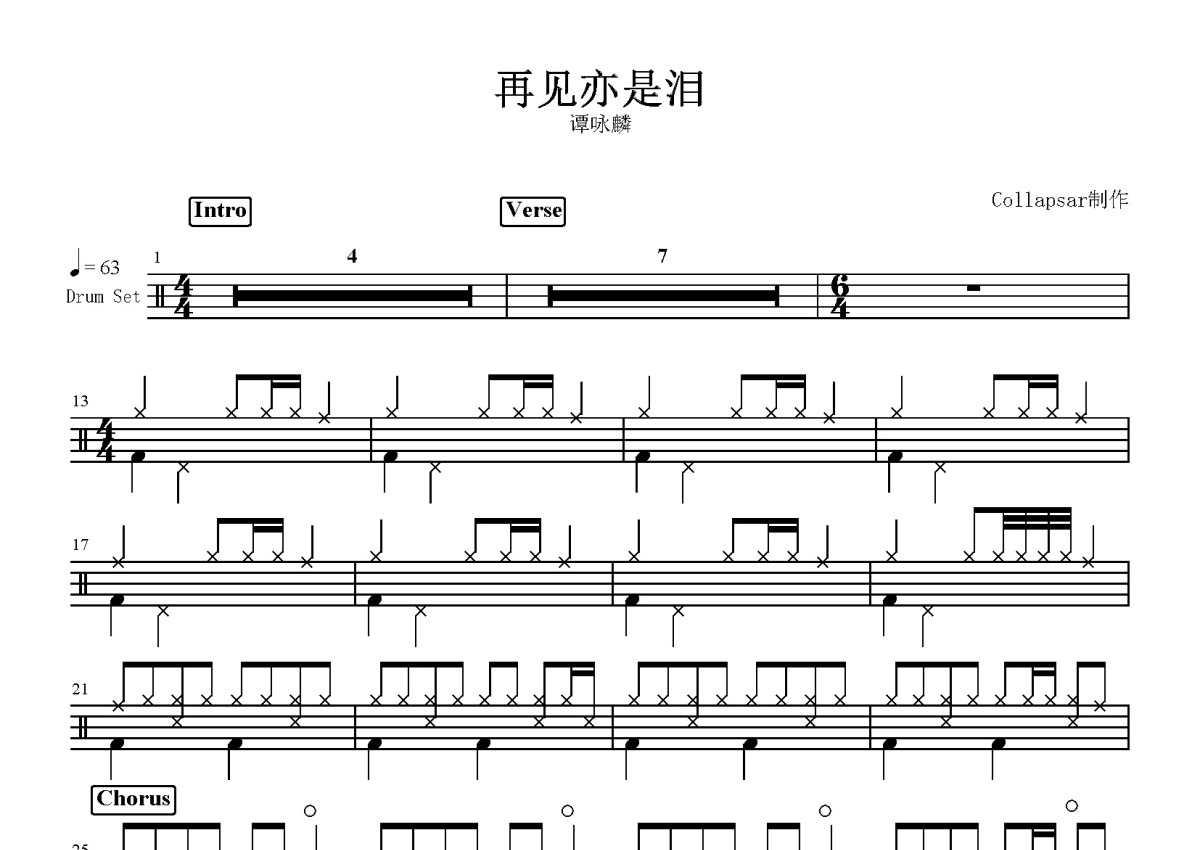 谭咏麟《再见亦是泪》鼓谱 - 架子鼓谱