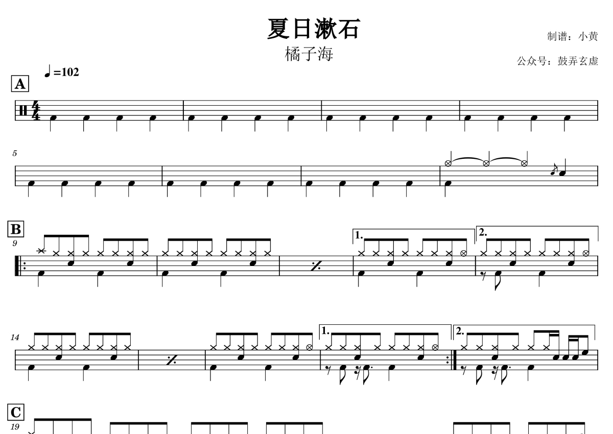 《夏日漱石》是橘子海演唱的一首歌曲,这份鼓谱共有三张高清图谱,图谱由 @小黄 编配上传,图谱使用五线谱编配,使用这份夏日漱石架子鼓谱,你将能够轻松地敲打出这首橘子海的夏日漱石,快来尝试吧。