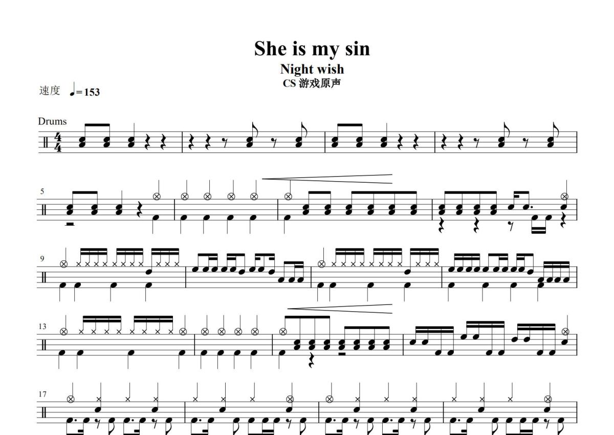 《She Is My Sin》是Nightwish夜愿演唱的一首歌曲,这份鼓谱共有四张高清图谱,图谱由 @打鼓谱 编配上传,图谱使用五线谱编配,使用这份She Is My Sin架子鼓谱,你将能够轻松地敲打出这首Nightwish夜愿的She Is My Sin,快来尝试吧。《She Is My Sin》是由Tuomas Holopainen作词作曲,芬兰乐团Nightwish演唱的歌曲。该曲收录于2000年7月18日发行的专辑《Wishmaster》中 [1] 。