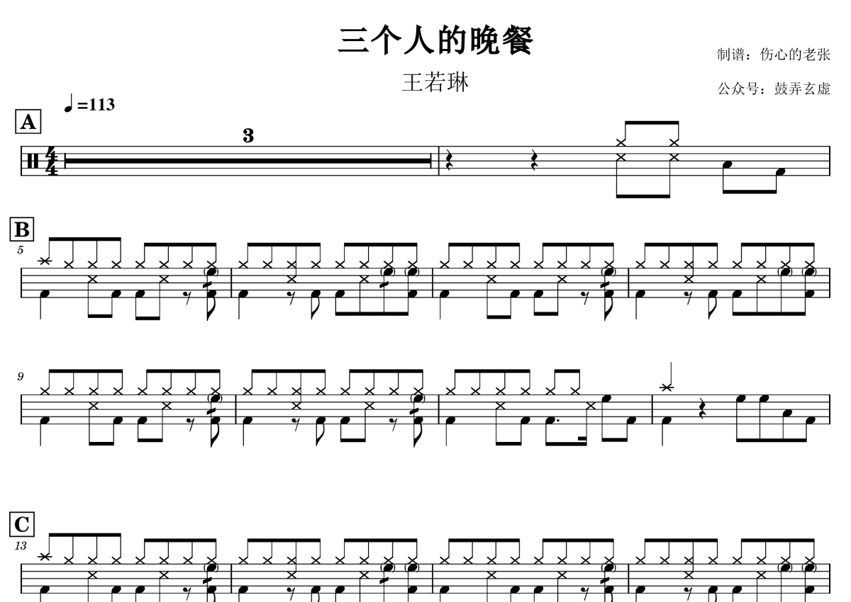 王若琳《三个人的晚餐》鼓谱 - 架子鼓谱
