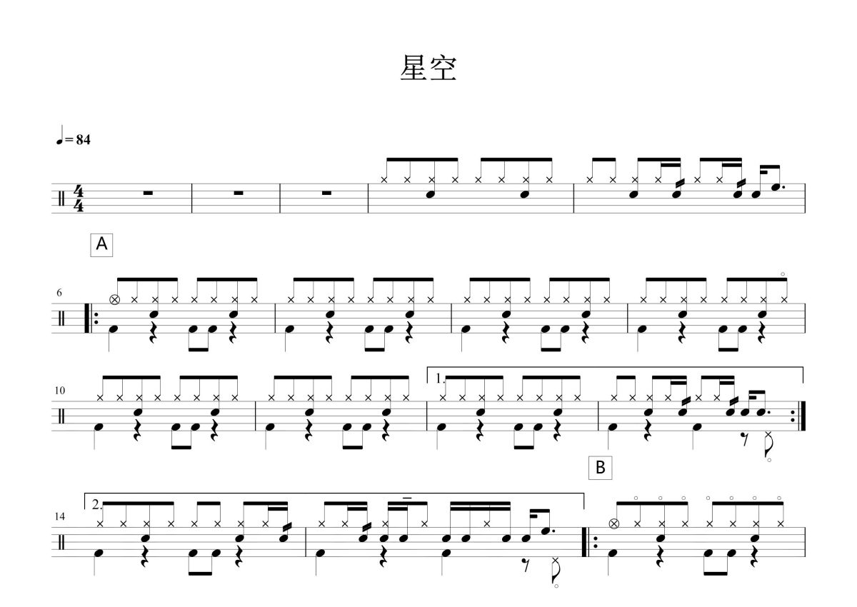 《星空》是五月天演唱的一首歌曲,这份鼓谱共有两张高清图谱,图谱由 @打鼓谱 编配上传,图谱使用五线谱编配,使用这份星空架子鼓谱,你将能够轻松地敲打出这首五月天的星空,快来尝试吧。《星空》是五月天演唱的一首歌,由石头谱曲、阿信填词,收录在五月天2011年发行的第八张专辑《第二人生》中,是电影《星空》的主题曲。