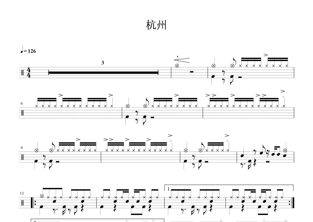 《杭州》是李志演唱的一首歌曲,这份鼓谱共有三张高清图谱,图谱由 @打鼓谱 编配上传,图谱使用五线谱编配,使用这份杭州架子鼓谱,你将能够轻松地敲打出这首李志的杭州,快来尝试吧。《杭州》是由李志作词、作曲并演唱的一首歌曲,收录于专辑《F》中,发行于2011年09月28日。