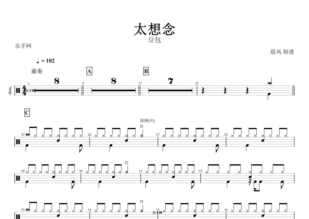 《太想念》是豆包演唱的一首歌曲,这份鼓谱共有两张高清图谱,图谱由 @打鼓谱 编配上传,图谱使用五线谱编配,使用这份太想念架子鼓谱,你将能够轻松地敲打出这首豆包的太想念,快来尝试吧。此谱出处来自乐手网分享。