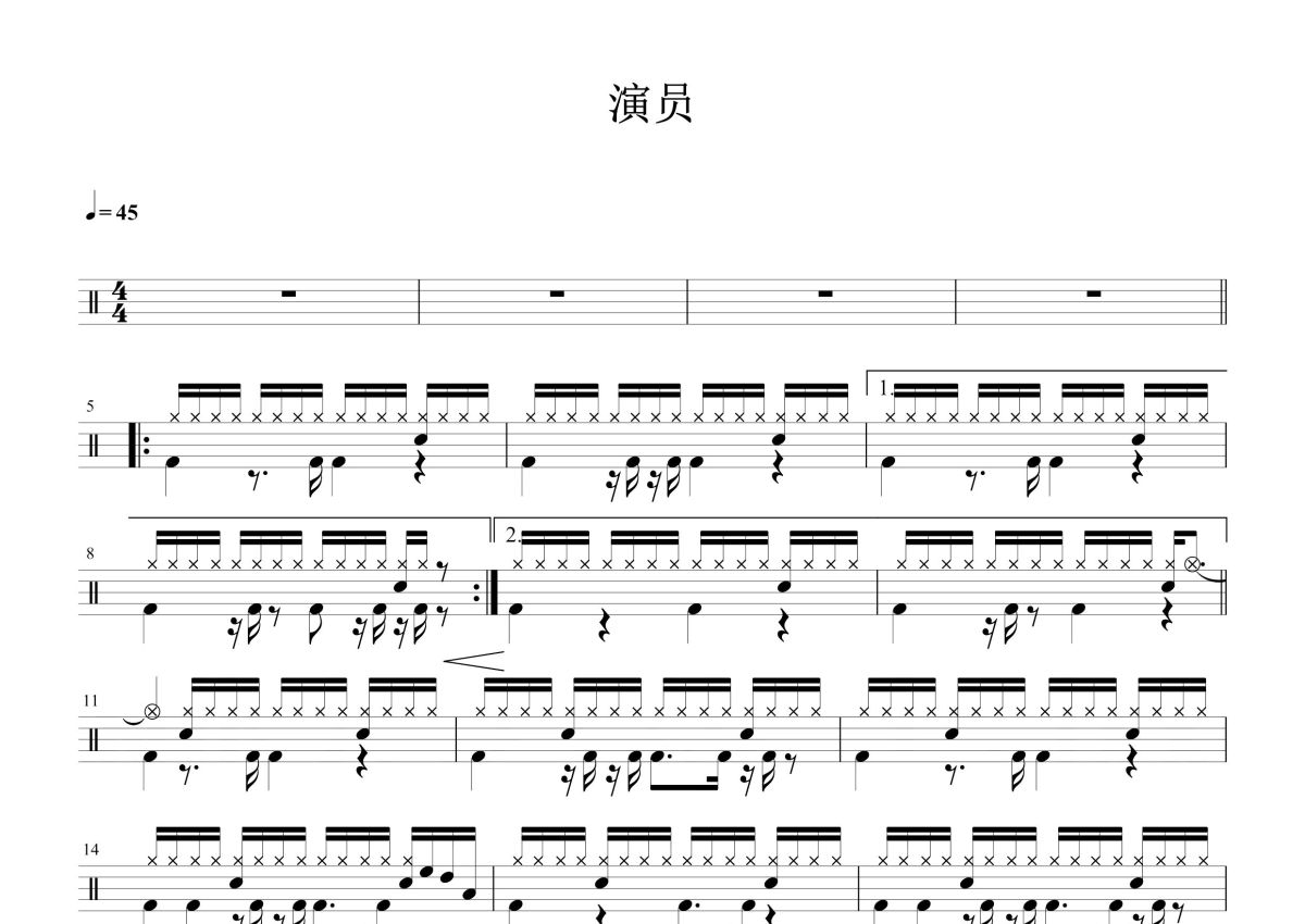 《演员》是薛之谦演唱的一首歌曲,这份鼓谱共有两张高清图谱,图谱由 @打鼓谱 编配上传,图谱使用五线谱编配,使用这份演员架子鼓谱,你将能够轻松地敲打出这首薛之谦的演员,快来尝试吧。《演员》是薛之谦演唱的一首歌曲,由薛之谦作词、作曲,收录在2015年5月20日薛之谦发行的EP《绅士》和2016年薛之谦发行的专辑《初学者》中 。 该曲2015年6月23日在全球中文音乐榜上榜夺得冠军 。