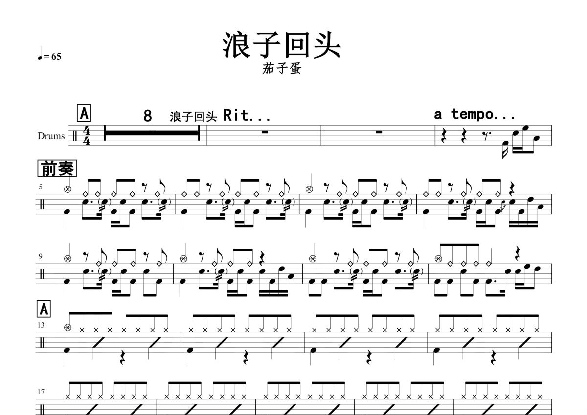 茄子蛋《浪子回头》鼓谱 - 架子鼓谱