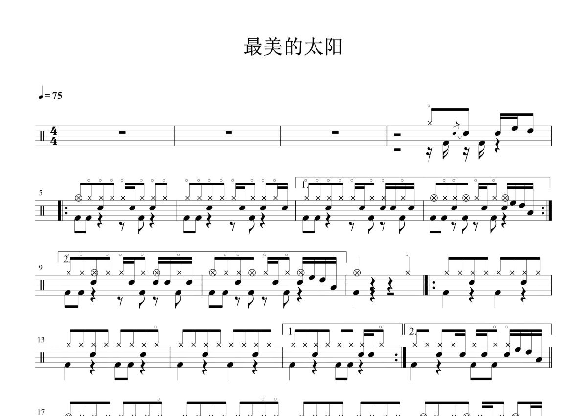 《最美的太阳》是张杰演唱的一首歌曲,这份鼓谱共有两张高清图谱,图谱由 @打鼓谱 编配上传,图谱使用五线谱编配,使用这份最美的太阳架子鼓谱,你将能够轻松地敲打出这首张杰的最美的太阳,快来尝试吧。《最美的太阳》是张杰演唱的一首歌曲,由刘吉宁作词作曲、周治平编曲,收录在张杰2007年发行的《最美的太阳》同名EP和2012年发行的《One Chance 张杰新歌+精选》专辑里。2007年12月4日中歌榜首播 。 2008年该歌曲获得中国歌曲排行榜第一季度金曲 。
