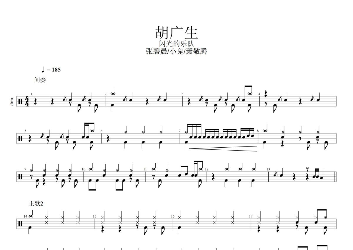 闪光的乐队/萧敬腾/张碧晨/Lil Ghost小鬼《胡广生》鼓谱 - 架子鼓谱