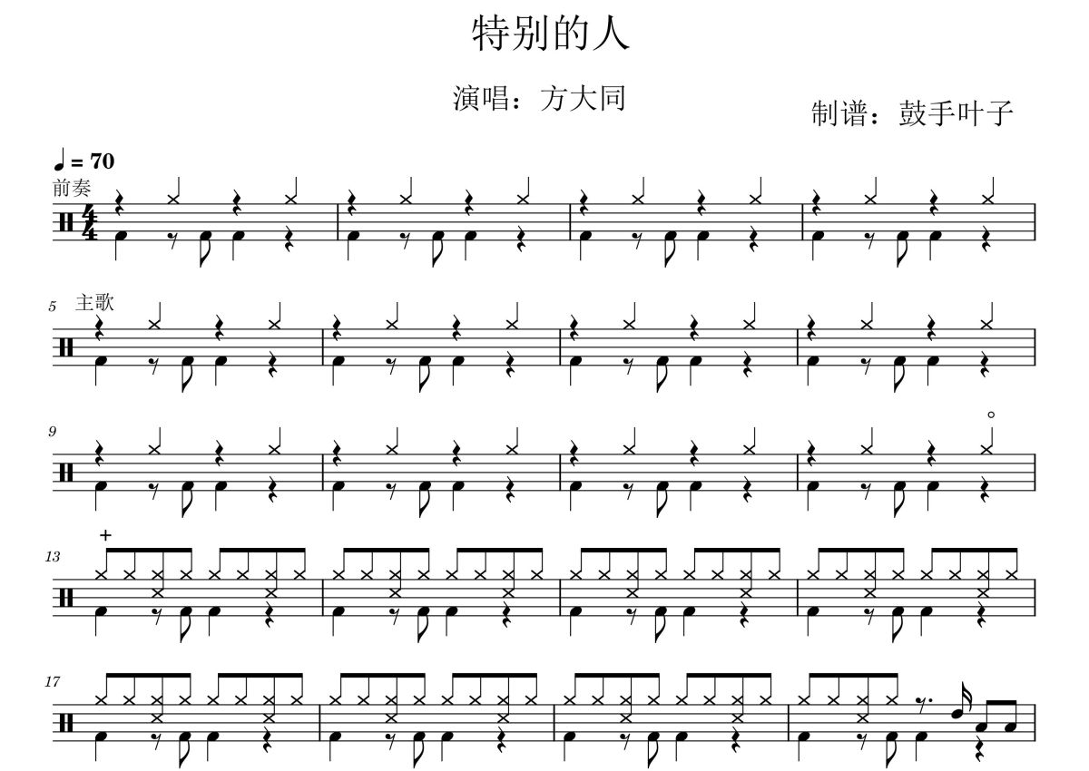 《特别的人》是方大同演唱的一首歌曲,这份鼓谱共有两张高清图谱,图谱由 @打鼓谱 编配上传,图谱使用五线谱编配,使用这份特别的人架子鼓谱,你将能够轻松地敲打出这首方大同的特别的人,快来尝试吧。喜欢的小伙伴可以搜索抖音加个关注~~~抖音号:drumeryezi。