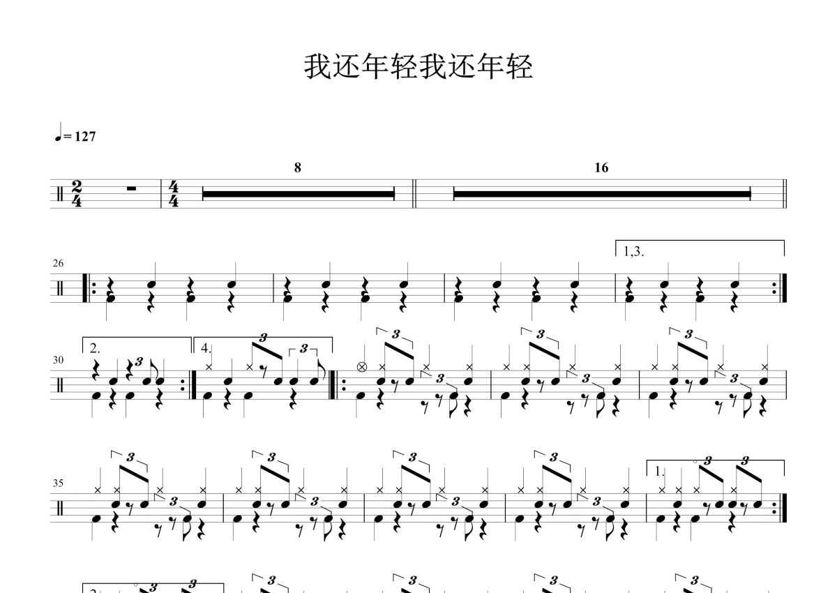 《我还年轻我还年轻》是老王乐队演唱的一首歌曲,这份鼓谱共有三张高清图谱,图谱由 @打鼓谱 编配上传,图谱使用五线谱编配,使用这份我还年轻我还年轻架子鼓谱,你将能够轻松地敲打出这首老王乐队的我还年轻我还年轻,快来尝试吧。《我还年轻我还年轻》是一首新民谣摇滚风格歌曲,是由张立长作词,老王乐队作曲,老王乐队演唱的歌曲。 给我一瓶酒,再给我一支烟,说走就走我有的是时间~。