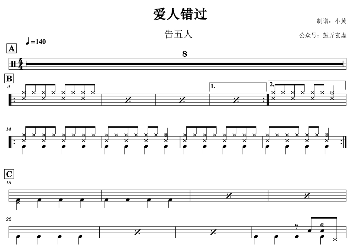 《爱人错过》是告五人演唱的一首歌曲,这份鼓谱共有三张高清图谱,图谱由 @小黄 编配上传,图谱使用五线谱编配,使用这份爱人错过架子鼓谱,你将能够轻松地敲打出这首告五人的爱人错过,快来尝试吧。