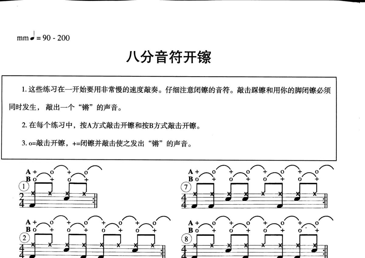 《开闭擦练习》是爵士鼓节奏大全演唱的一首歌曲,这份鼓谱共有四张高清图谱,图谱由 @打鼓谱 编配上传,图谱使用五线谱编配,使用这份开闭擦练习架子鼓谱,你将能够轻松地敲打出这首爵士鼓节奏大全的开闭擦练习,快来尝试吧。爵士鼓节奏大全。
