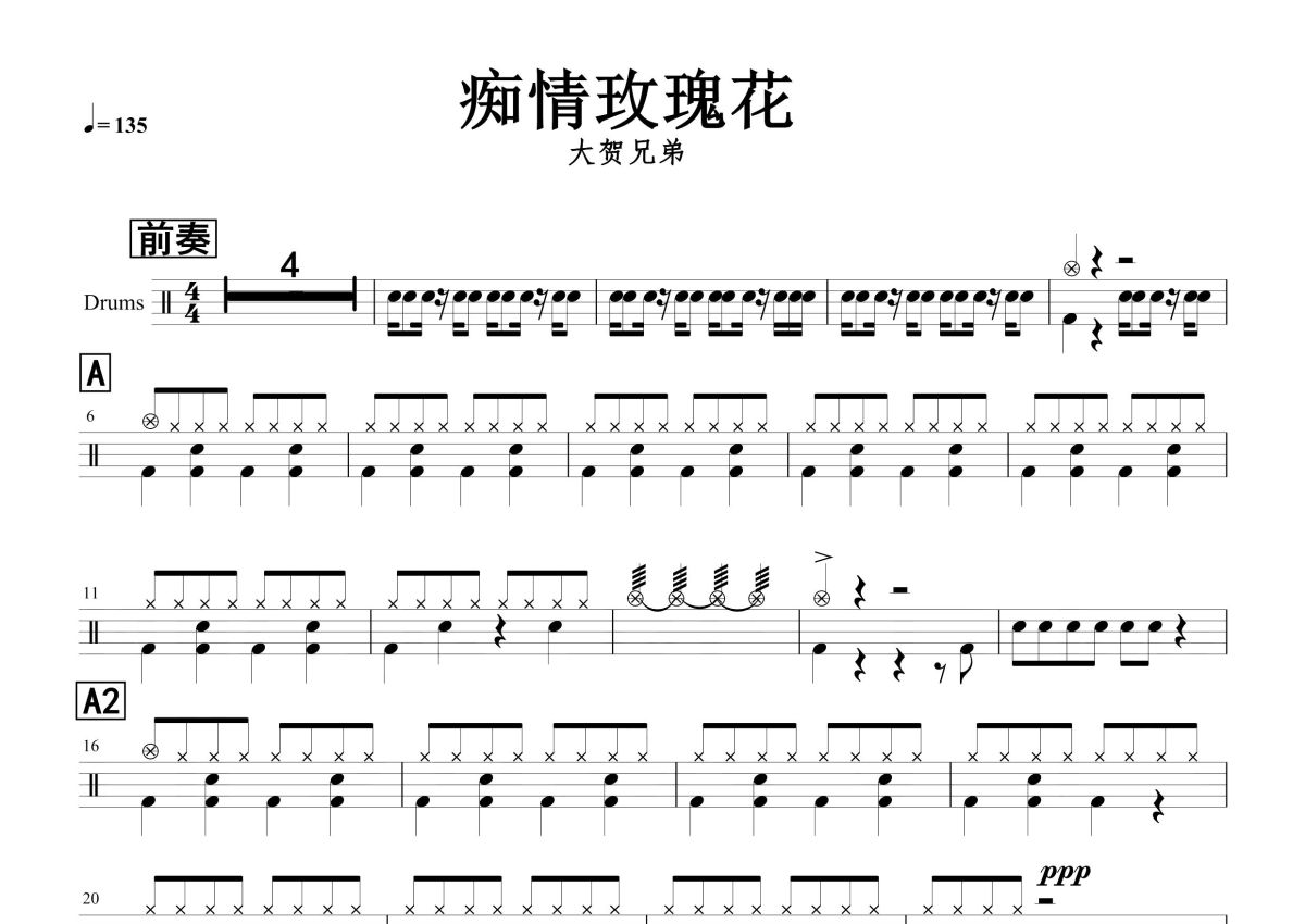 大贺兄弟《痴情玫瑰花》鼓谱 - 架子鼓谱