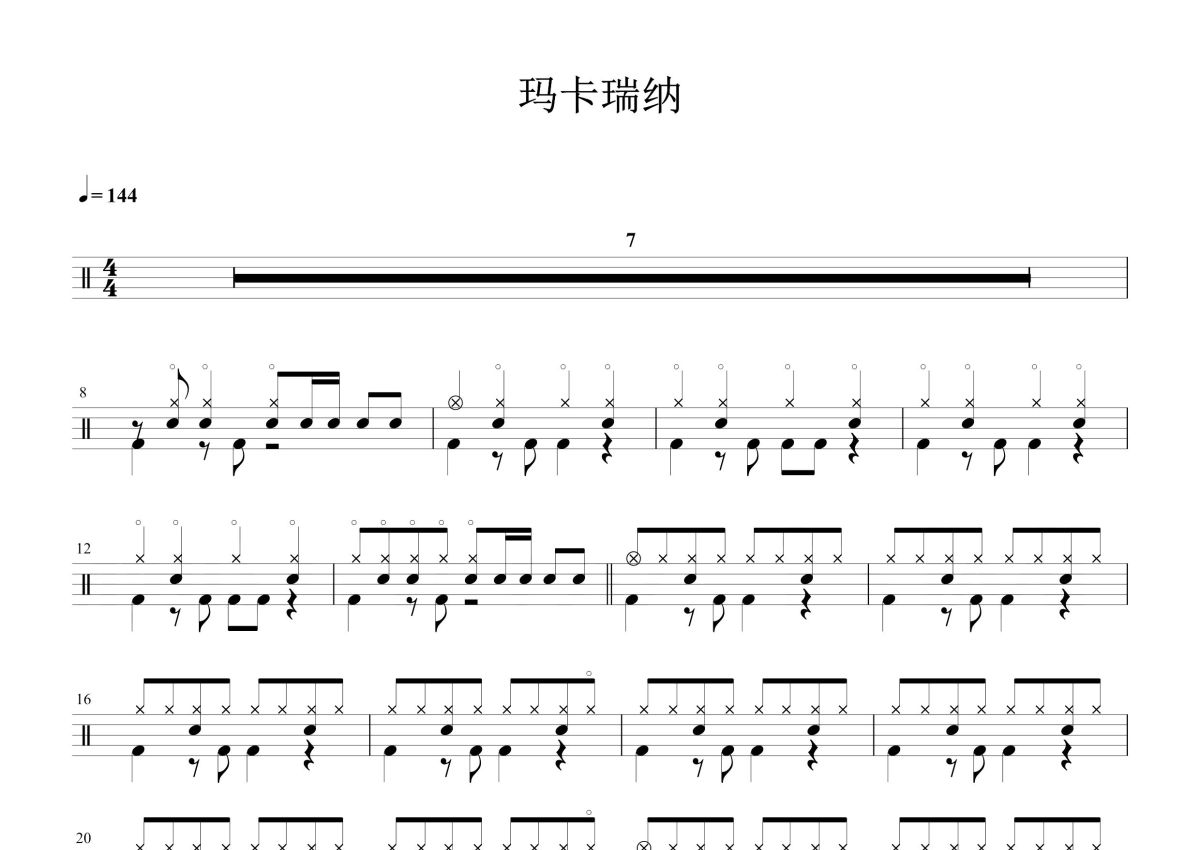 《玛卡瑞纳》是海龟先生演唱的一首歌曲,这份鼓谱共有三张高清图谱,图谱由 @打鼓谱 编配上传,图谱使用五线谱编配,使用这份玛卡瑞纳架子鼓谱,你将能够轻松地敲打出这首海龟先生的玛卡瑞纳,快来尝试吧。《玛卡瑞纳》收录于《摩登天空7》合辑里,所有会用音乐表达的人都知道,相较于文字,音乐更能准确、感性、无限接近地表达一个人的想法,但可惜的是大部分人都习惯并相信文字的表达,于是为了让更多的人理解音乐创作者的表达,歌词作为一种音乐语言的翻译文本存在。而海龟先生的歌词创作方法则有一点别致,他们非常擅长把即兴哼出来的“人类听不懂的语言”转化成优美的歌词,比如说这首成名之作《玛卡瑞纳》。