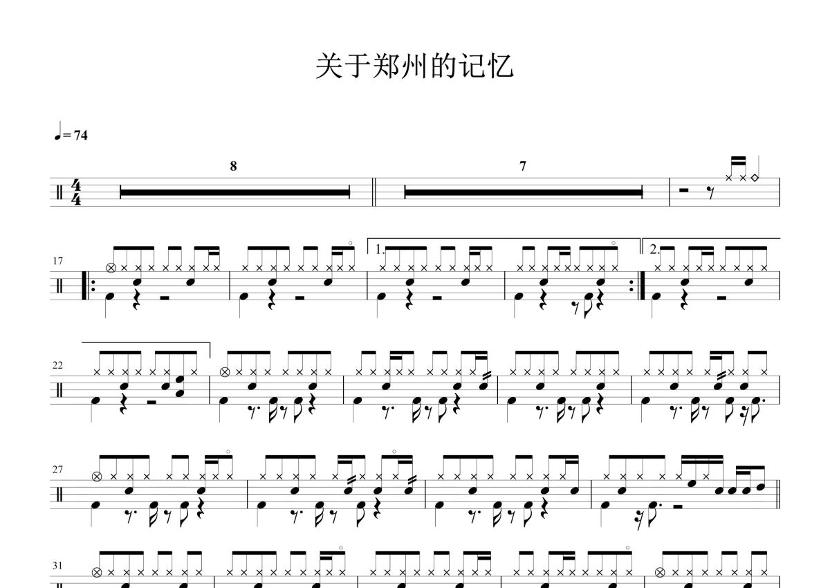 《关于郑州的记忆》是李志演唱的一首歌曲,这份鼓谱共有一张高清图谱,图谱由 @打鼓谱 编配上传,图谱使用五线谱编配,使用这份关于郑州的记忆架子鼓谱,你将能够轻松地敲打出这首李志的关于郑州的记忆,快来尝试吧。《关于郑州的记忆》是中国民谣诗人李志作词作曲并演唱的一首歌曲,收录于2010年9月1日发布的李志第五张专辑《你好,郑州》之中。