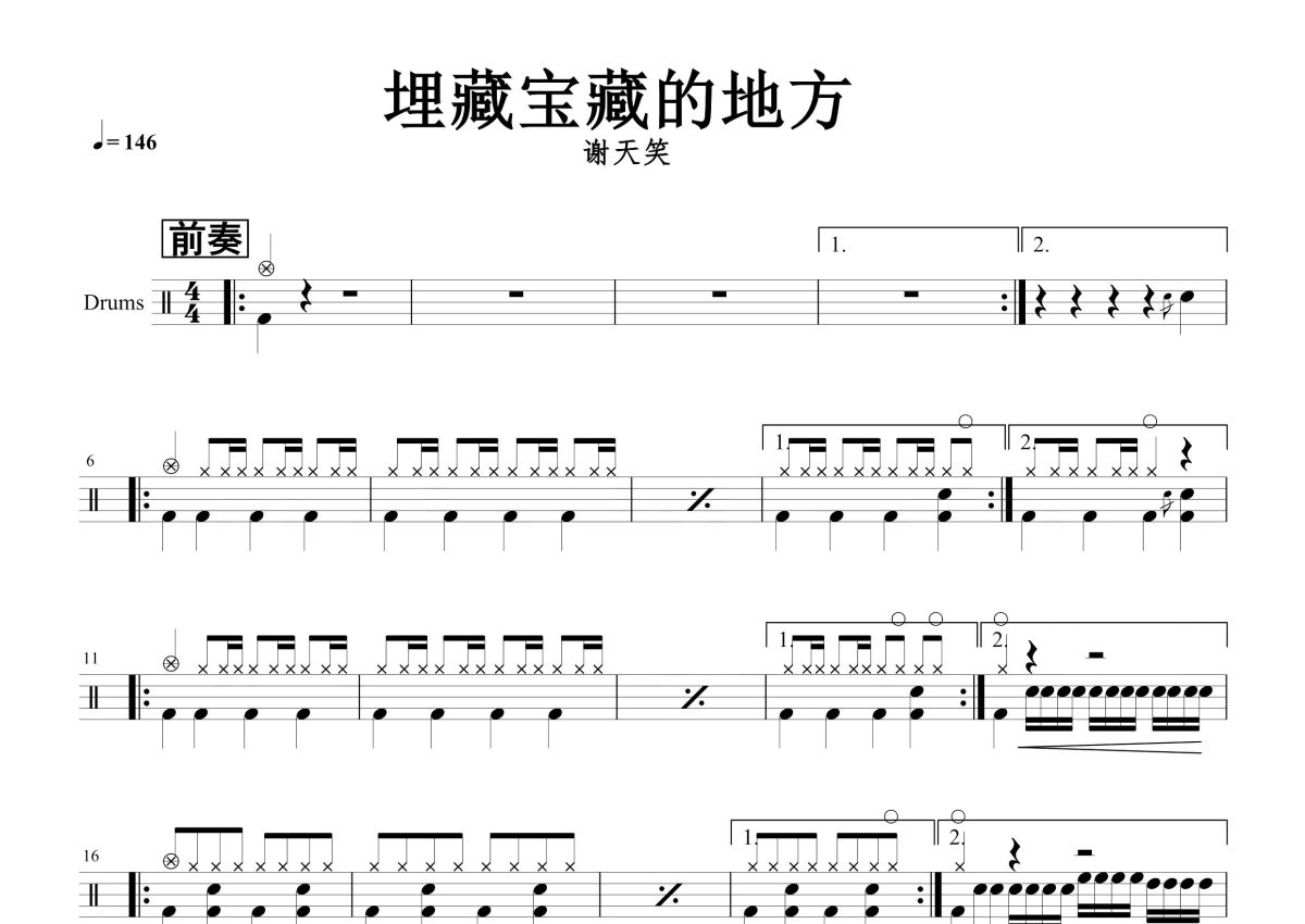 《埋葬宝藏的地方》是谢天笑演唱的一首歌曲,这份鼓谱共有五张高清图谱,图谱由 @打鼓谱 编配上传,图谱使用五线谱编配,使用这份埋葬宝藏的地方架子鼓谱,你将能够轻松地敲打出这首谢天笑的埋葬宝藏的地方,快来尝试吧。《埋藏宝藏的地方》是谢天笑演唱的歌曲,收录于专辑《冷血动物》中,发行与2000年。