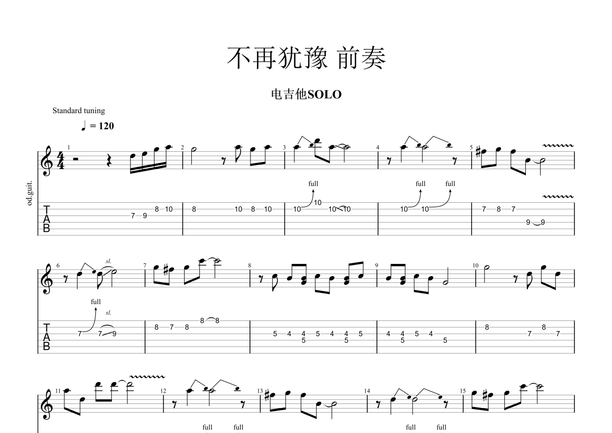 《不再犹豫》是BEYOND演唱的一首歌曲,前奏,这份电吉他谱共有一张高清图谱,图谱由 @玉帝哥哥 编配上传,图谱使用六线谱编配,曲谱配备了相关的音频提供试听,使用这份不再犹豫电吉他谱,可以让你更加方便地掌握这首歌曲的演奏技巧,快来尝试吧。BEYOND《不再犹豫》吉他谱_电吉他谱_前奏。