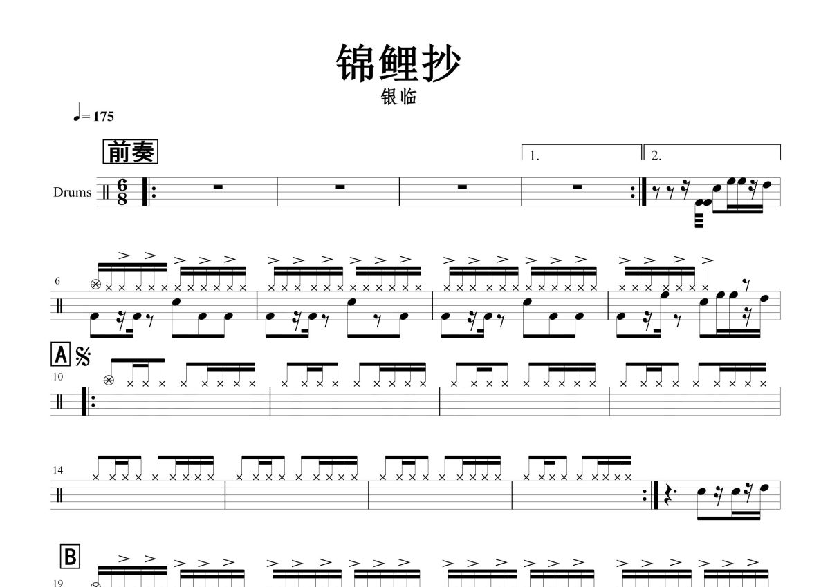《锦鲤抄》是银临演唱的一首歌曲,这份鼓谱共有两张高清图谱,图谱由 @打鼓谱 编配上传,图谱使用五线谱编配,使用这份锦鲤抄架子鼓谱,你将能够轻松地敲打出这首银临的锦鲤抄,快来尝试吧。《锦鲤抄》由云の泣、 银临演唱的一首古风原创歌曲。 属于“《异闻录》系列”第一篇 ,亦是2013年十大古风歌曲之一。 收录于专辑《腐草为萤》。