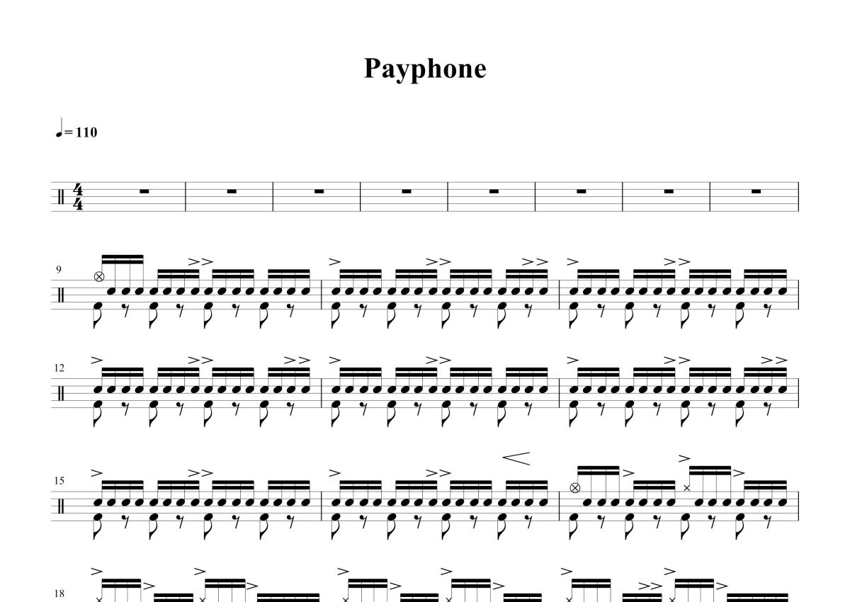 《Payphone》是Maroon 5&Wiz Khalifa演唱的一首歌曲,这份鼓谱共有三张高清图谱,图谱由 @打鼓谱 编配上传,图谱使用五线谱编配,使用这份Payphone架子鼓谱,你将能够轻松地敲打出这首Maroon 5&Wiz Khalifa的Payphone,快来尝试吧。《Payphone》是美国流行乐队魔力红演唱的歌曲。歌曲由亚当·莱文、Benny Blanco、Ammar Malik、Robopop、Shellback和维兹·卡利法共同创作,收录在魔力红第四张录音室专辑《Overexposed》中,于2012年4月17日由A&M Octone唱片发行。