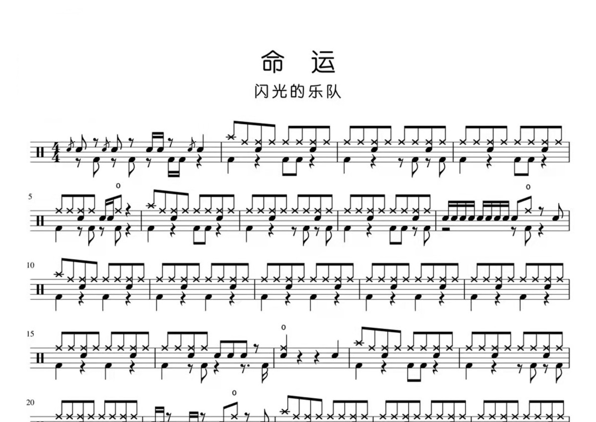 《命运》是闪光的乐队演唱的一首歌曲,这份鼓谱共有两张高清图谱,图谱由 @打鼓谱 编配上传,图谱使用五线谱编配,使用这份命运架子鼓谱,你将能够轻松地敲打出这首闪光的乐队的命运,快来尝试吧。《命运》闪光的乐队。