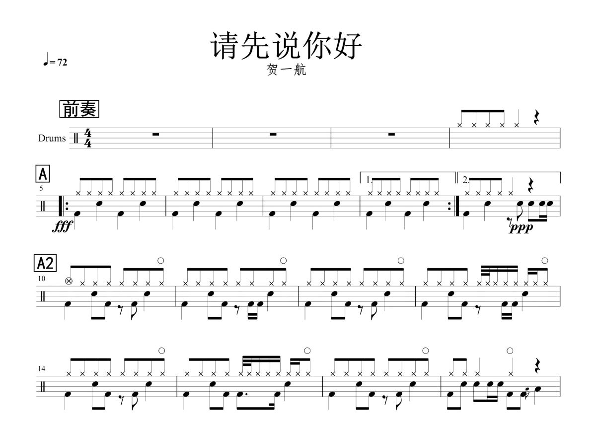 贺一航《请先说你好》鼓谱 - 架子鼓谱