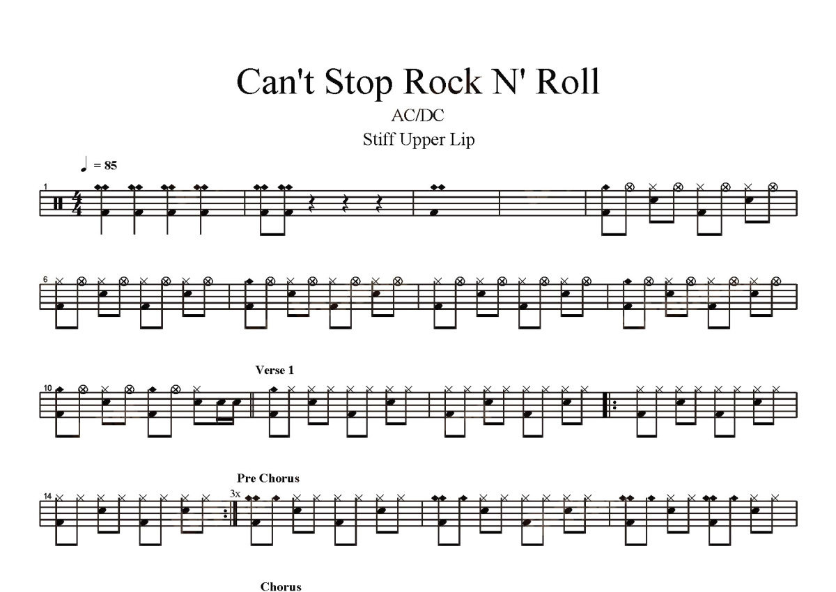 《Can't Stop Rock N' Roll》是Twisted Sister演唱的一首歌曲,这份鼓谱共有两张高清图谱,图谱由 @打鼓谱 编配上传,图谱使用五线谱编配,使用这份Can't Stop Rock N' Roll架子鼓谱,你将能够轻松地敲打出这首Twisted Sister的Can't Stop Rock N' Roll,快来尝试吧。You Can't Stop Rock 'N' Roll (Live Version) - Twisted Sister
