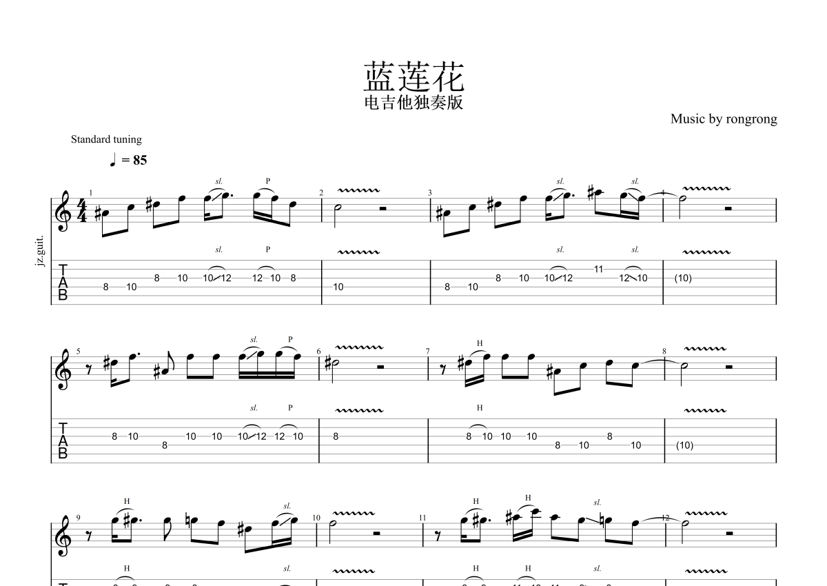 《蓝莲花》是许巍演唱的一首歌曲,电吉他独奏版,这份电吉他谱共有四张高清图谱,图谱由 @玉帝哥哥 编配上传,图谱使用六线谱编配,曲谱配备了相关的音频提供试听,使用这份蓝莲花电吉他谱,可以让你更加方便地掌握这首歌曲的演奏技巧,快来尝试吧。许巍《蓝莲花》吉他谱_电吉他谱_电吉他独奏版。
