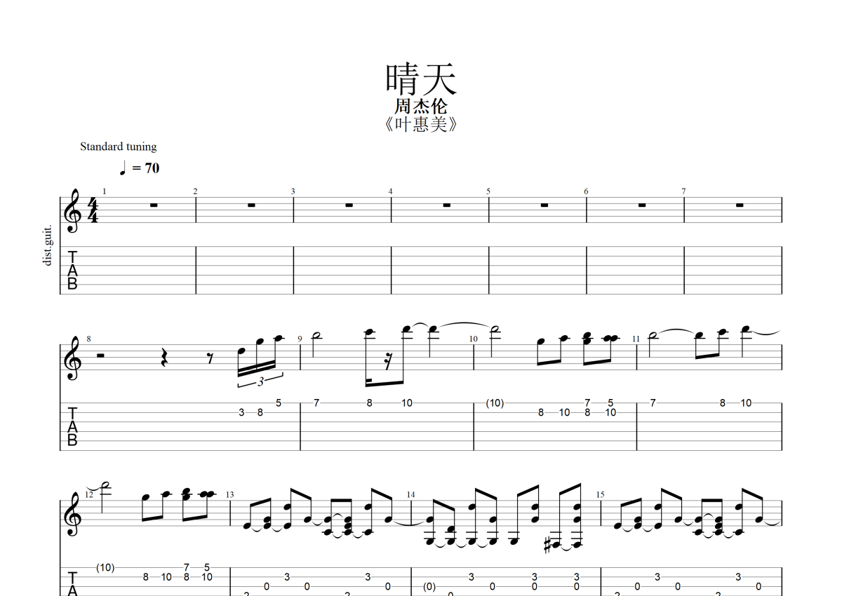 《晴天》是周杰伦演唱的一首歌曲,这份电吉他谱共有三张高清图谱,图谱由 @玉帝哥哥 编配上传,图谱使用六线谱编配,曲谱配备了相关的音频提供试听,使用这份晴天电吉他谱,可以让你更加方便地掌握这首歌曲的演奏技巧,快来尝试吧。周杰伦《晴天》吉他谱_电吉他谱。