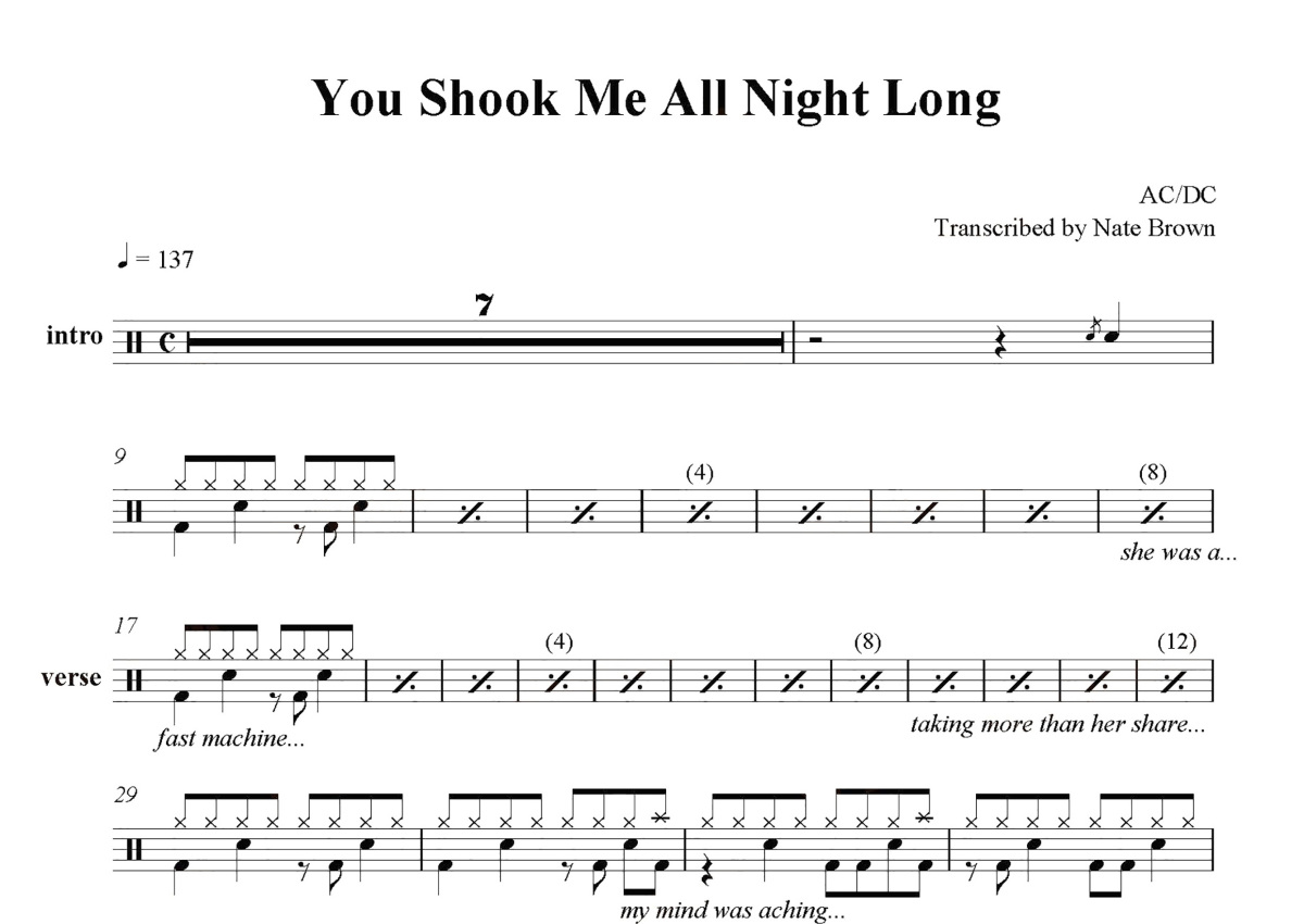ACDC《You Shook Me All Night Long》鼓谱 - 架子鼓谱