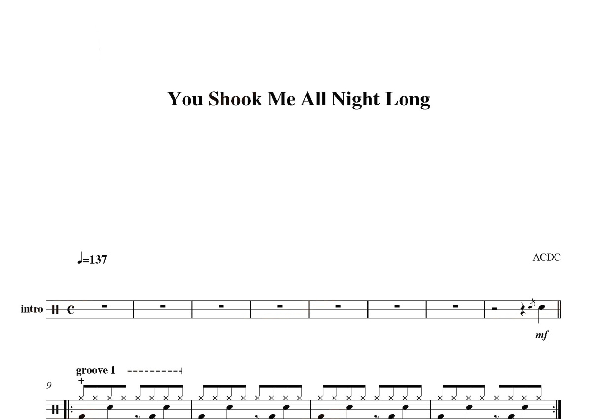 《You Shook Me All Night Long 2》是AcDc演唱的一首歌曲,这份鼓谱共有三张高清图谱,图谱由 @打鼓谱 编配上传,图谱使用五线谱编配,使用这份You Shook Me All Night Long 2架子鼓谱,你将能够轻松地敲打出这首AcDc的You Shook Me All Night Long 2,快来尝试吧。《You Shook Me All Night Long》是ACDC乐队(澳大利亚)演唱的一首歌曲,收录于《Back In Black》专辑中。