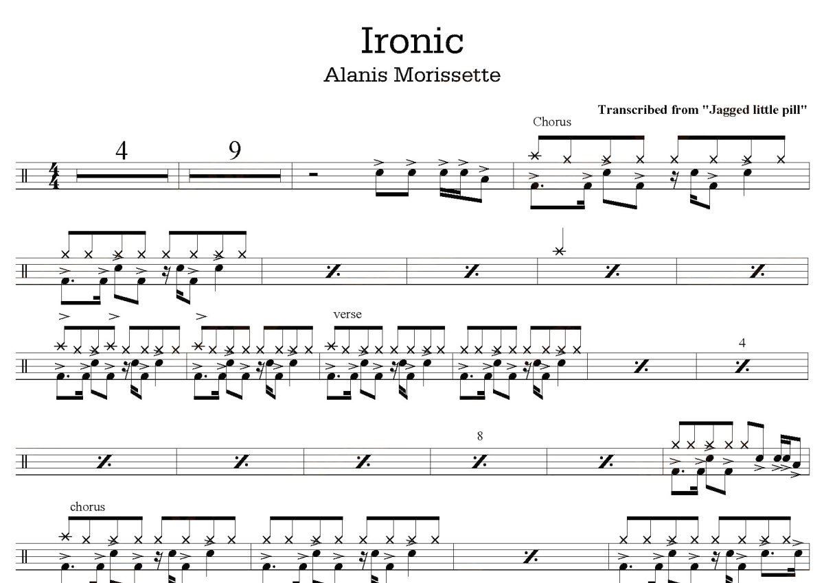 《Ironic》是Alanis Morissette演唱的一首歌曲,这份鼓谱共有一张高清图谱,图谱由 @打鼓谱 编配上传,图谱使用五线谱编配,使用这份Ironic架子鼓谱,你将能够轻松地敲打出这首Alanis Morissette的Ironic,快来尝试吧。《Ironic》歌