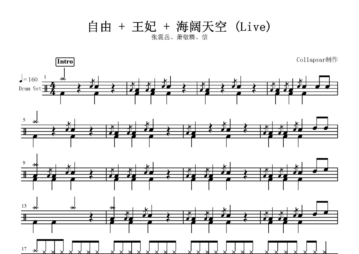 张震岳/萧敬腾/信《自由 + 王妃 + 海阔天空》鼓谱 - 架子鼓谱 - Live