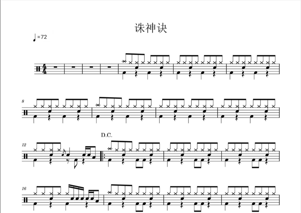 《诛神诀》是七叔演唱的一首歌曲,这份鼓谱共有一张高清图谱,图谱由 @打鼓谱 编配上传,图谱使用五线谱编配,使用这份诛神诀架子鼓谱,你将能够轻松地敲打出这首七叔的诛神诀,快来尝试吧。第一段打完反复到D.C,到Dsalcoda反复到D.S完了接第二段结束。 。