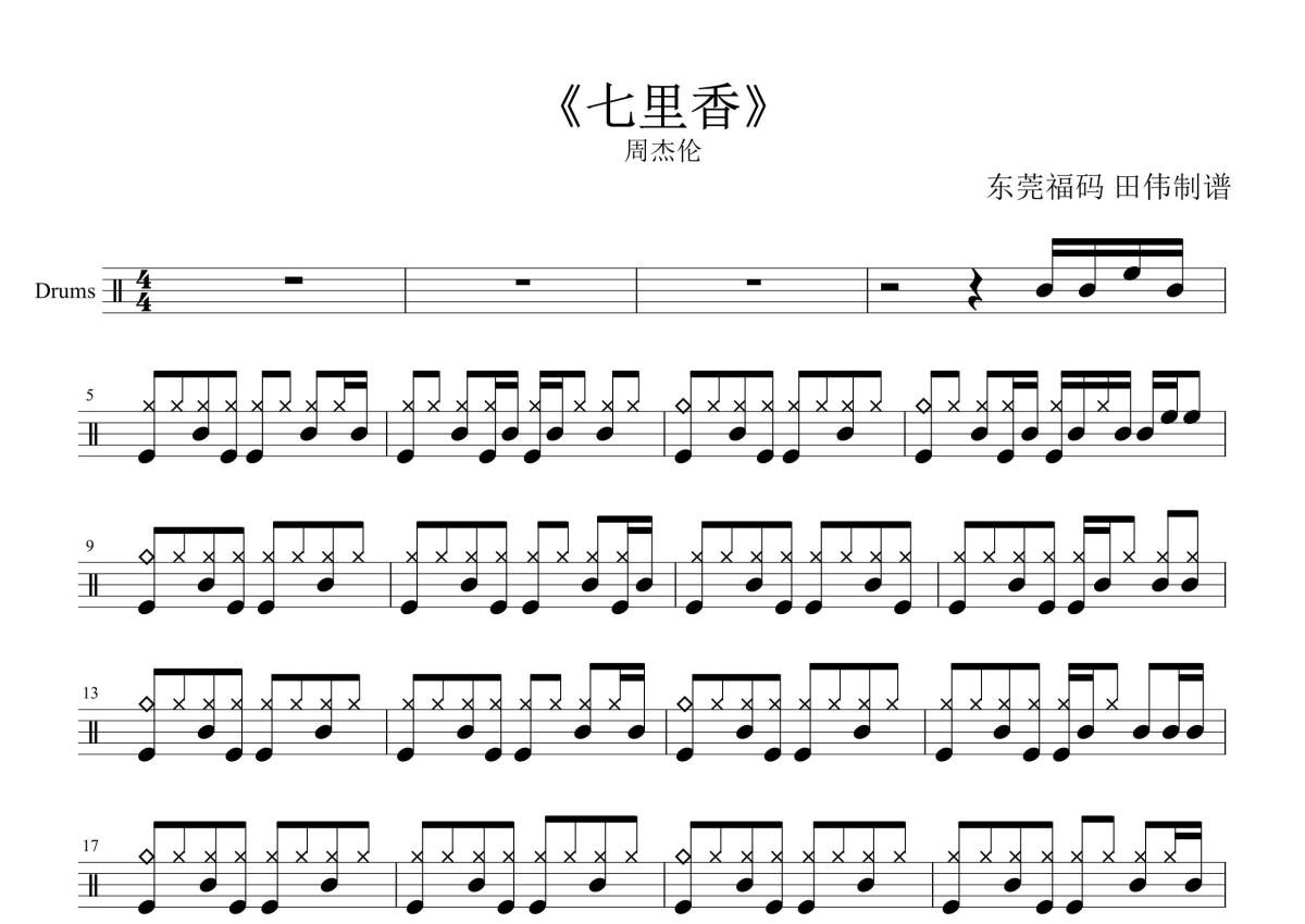 《七里香》是周杰伦演唱的一首歌曲,这份鼓谱共有两张高清图谱,图谱由 @打鼓谱 编配上传,图谱使用五线谱编配,使用这份七里香架子鼓谱,你将能够轻松地敲打出这首周杰伦的七里香,快来尝试吧。《七里香》周杰伦演唱,方文山作词,周杰伦谱曲,钟兴民编曲 ,收录在周杰伦2004年8月3日发行的同名专辑《七里香》中 。