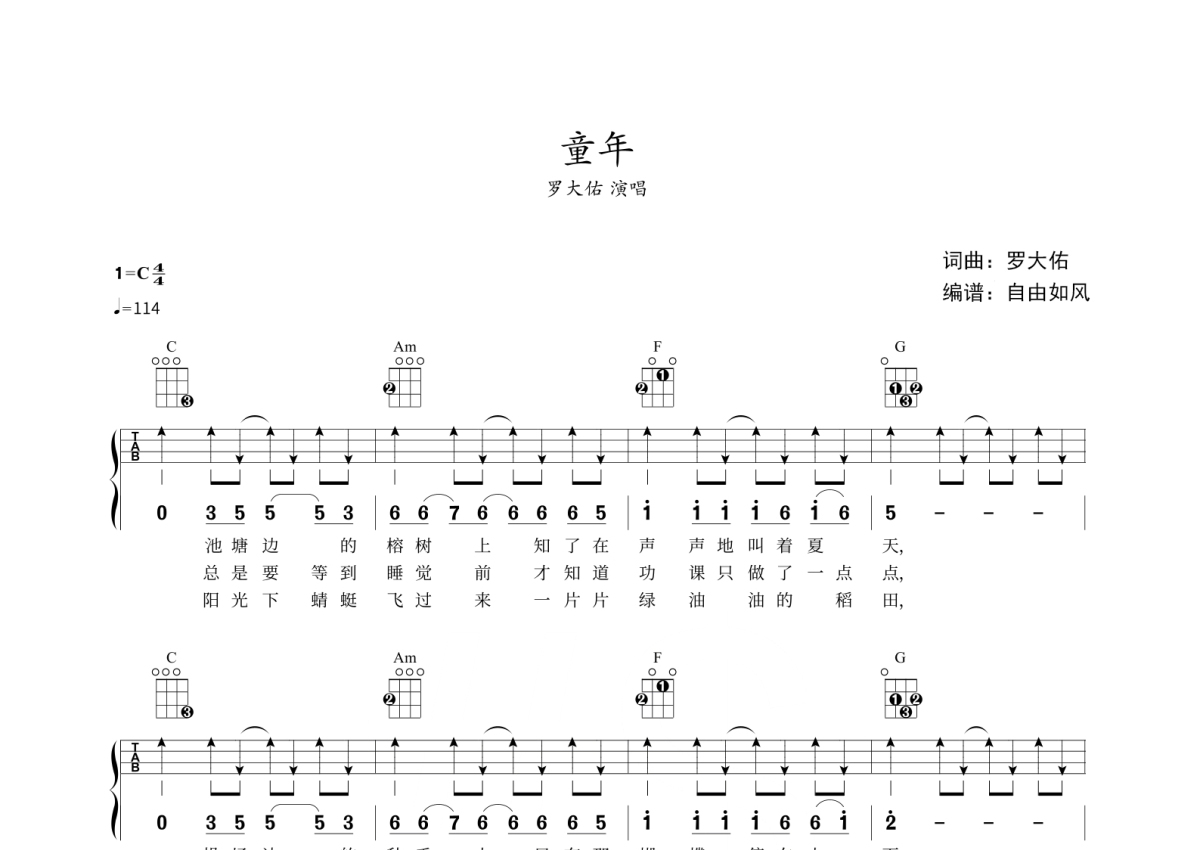 《童年》是罗大佑演唱的一首歌曲,扫弦,本尤克里里谱采用的是C调指法编配,这份尤克里里谱共有一张高清图谱,图谱由 @自由如风 编配上传,图谱使用四线谱编配,包含尤克里里和弦指法、简谱以及歌词部分,使用这份童年尤克里里谱,可以让你更加方便地掌握这首歌曲的弹唱技巧,快来尝试吧。罗大佑《童年》_C调尤克里里谱_扫弦。