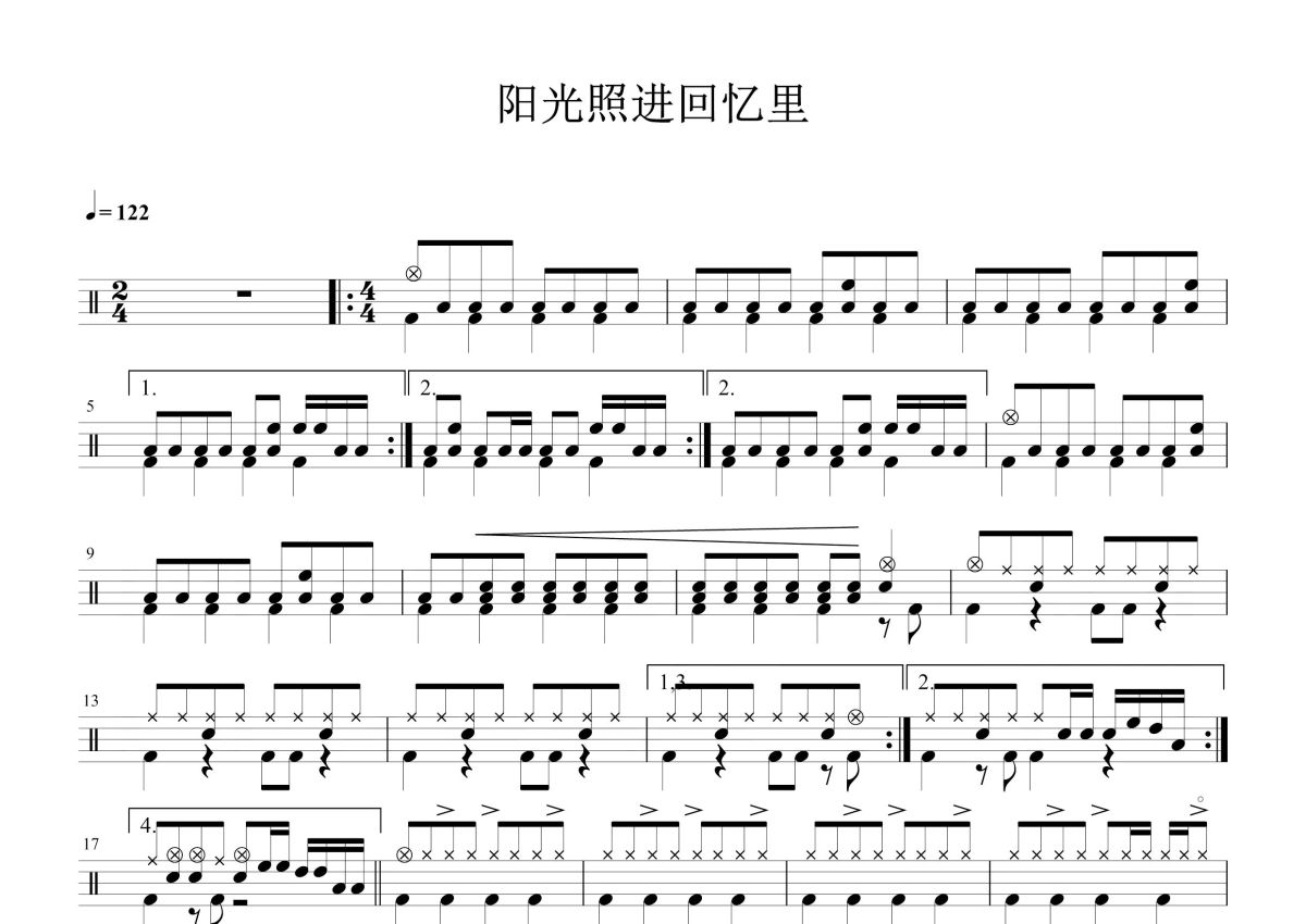 《阳光照进回忆里》是逃跑计划演唱的一首歌曲,这份鼓谱共有三张高清图谱,图谱由 @打鼓谱 编配上传,图谱使用五线谱编配,使用这份阳光照进回忆里架子鼓谱,你将能够轻松地敲打出这首逃跑计划的阳光照进回忆里,快来尝试吧。逃跑计划歌曲,首先发表于《就是现在2011红牛新能量音乐计划合辑》,后收录于首张专辑《世界》。