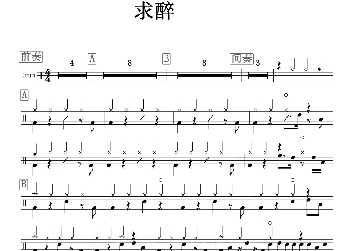 《求醉》是广东雨神演唱的一首歌曲,这份鼓谱共有两张高清图谱,图谱由 @打鼓谱 编配上传,图谱使用五线谱编配,使用这份求醉架子鼓谱,你将能够轻松地敲打出这首广东雨神的求醉,快来尝试吧。《求醉》是由广东雨神演唱的一首歌曲。