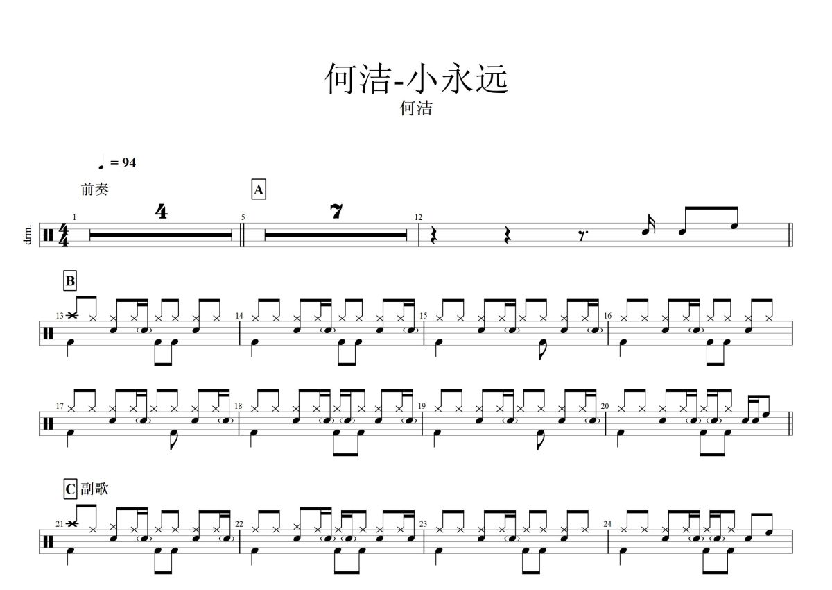《小永远》是何洁演唱的一首歌曲,这份鼓谱共有两张高清图谱,图谱由 @打鼓谱 编配上传,图谱使用五线谱编配,使用这份小永远架子鼓谱,你将能够轻松地敲打出这首何洁的小永远,快来尝试吧。《小永远》何洁。