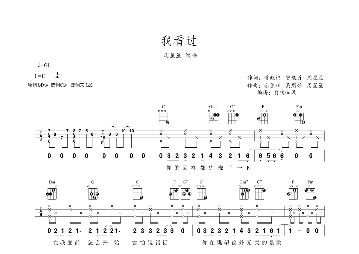 周星星《我看过》尤克里里谱 - C调尤克里里谱 - 分解和弦、扫弦